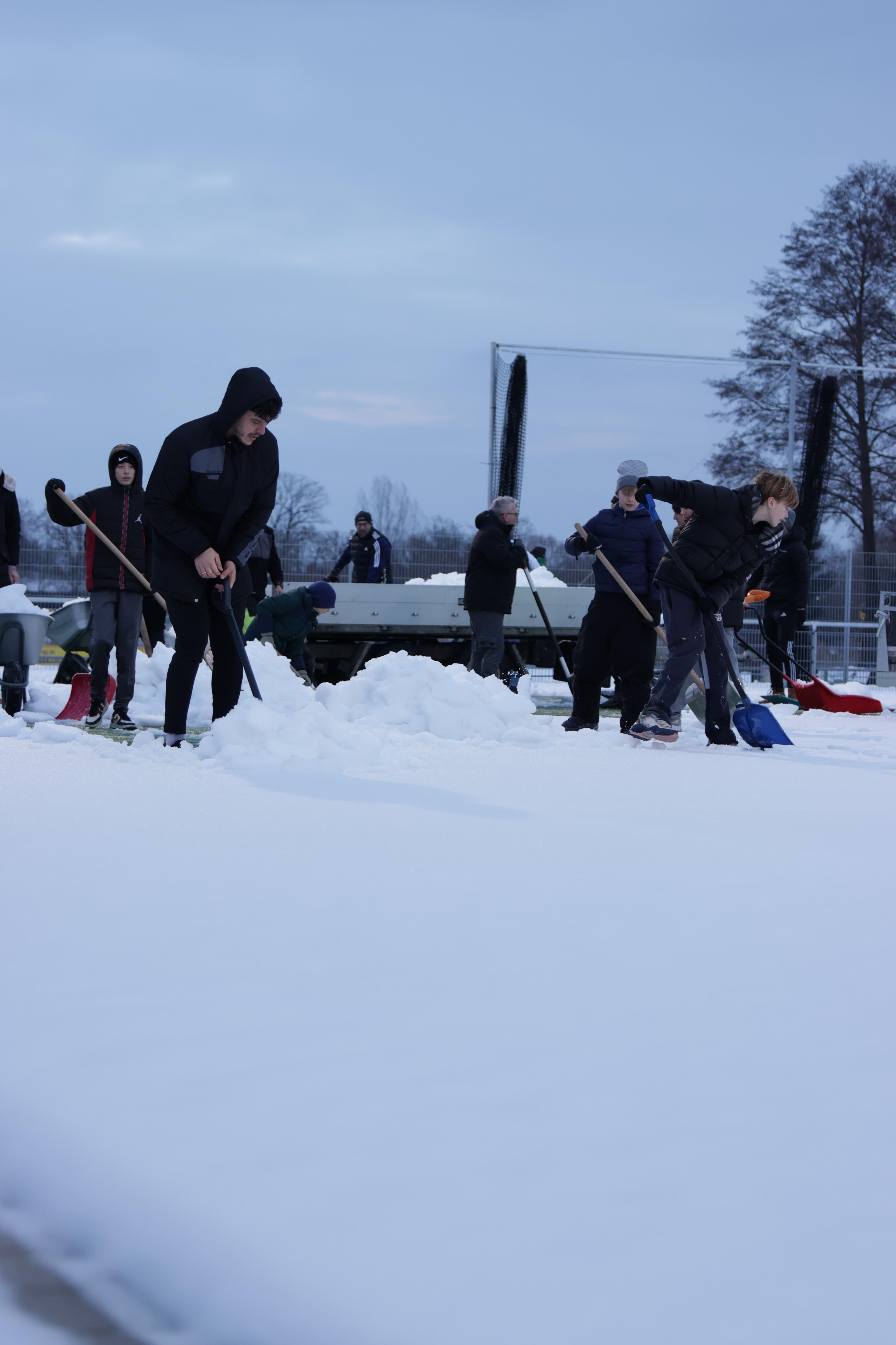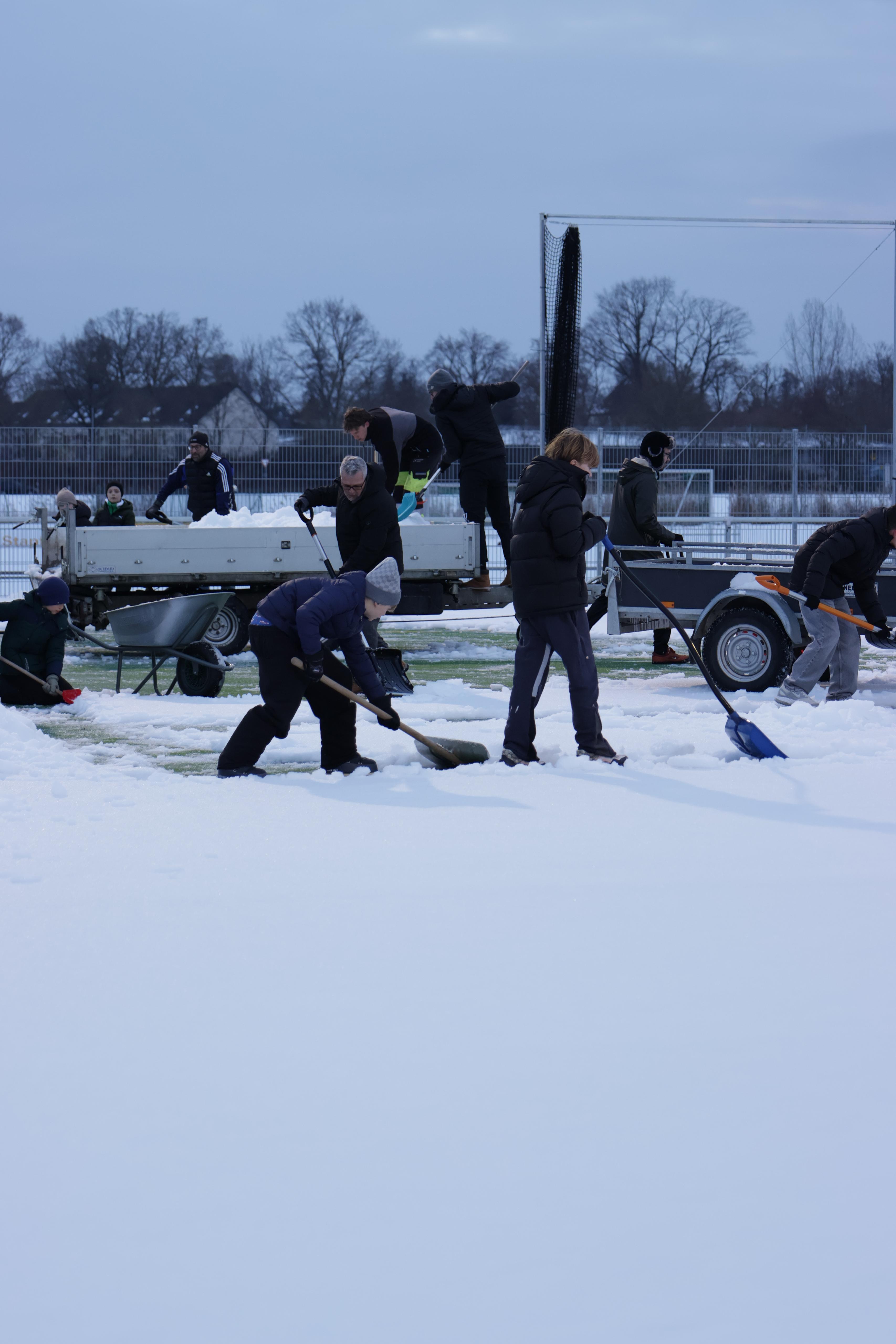 In einer tollen Aktion haben engagierte Helfer die Hälfte unseres Kunstrasenplatzes vom Schnee befreit. Mit Schaufeln, guter Laune und echtem Teamgeist wurde der Platz Stück für Stück wieder bespielbar gemacht.